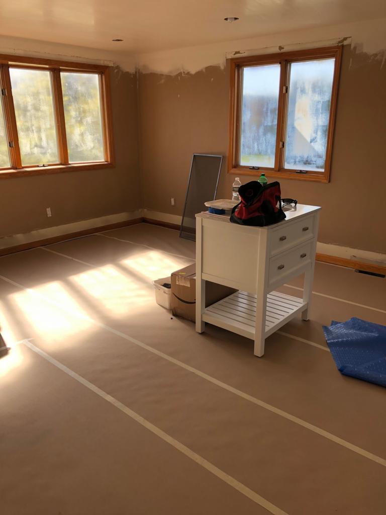 • Preparation: Cover all, doors, windows, cabinets, furniture with clean and new plastic and the floor with paper or drop cloths. Apply caulking, fix cracks, nail holes and other imperfections in walls and ceilings